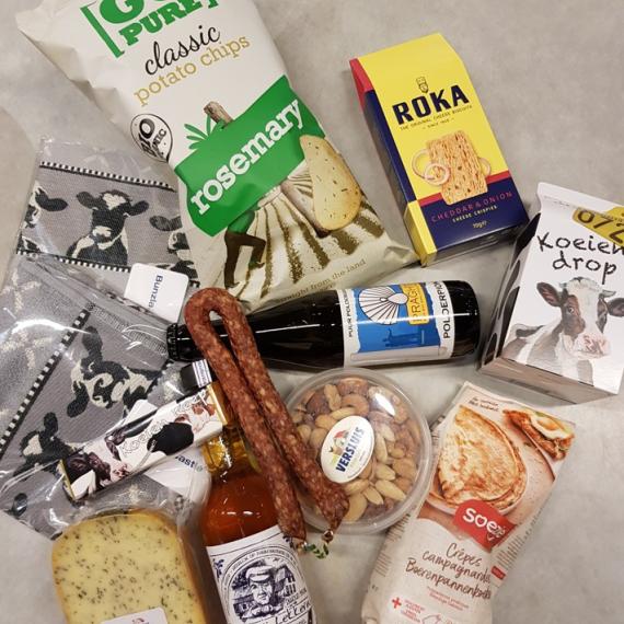 Dit heerlijke koeienkerstpakket bestaat uit een prachtige hand/theedoekenset van zeer goede kwaliteit, koeiendrop, pannenkoekenmix met pannenkoekenstroop, kaas, koetjesreep deluxe en lekkere borrelproducten zoals een lokaal gebrouwen biertje, chips uit Emmeloord, kaaskoekjes uit Emmeloord, heerlijke nootjes en een worstje (producten kunnen afwijken door verschillende soorten smaak en beschikbaarheid van de producten).